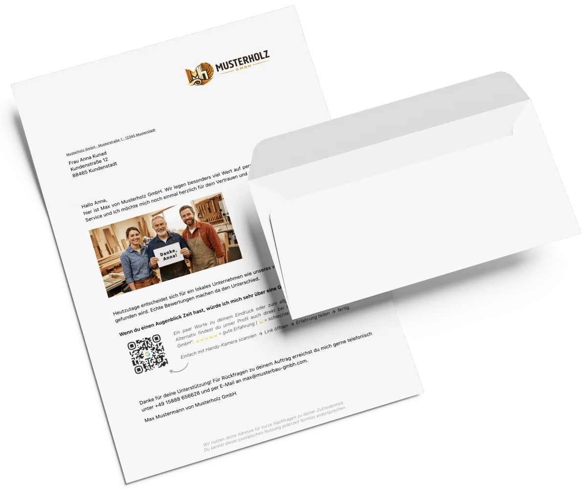 Wir erstellen, drucken und verschicken einen echten Dankesbrief per Post an deinen Kunden in deinem Namen. Inklusive einem automatisch personalisierten Foto deines Teams und einem QR-Code zur einfachen Bewertungsabgabe. Keine nervige “Feedback-Mail”, die im Spam landet, sondern echte Wertschätzung auf dem Küchentisch.
